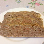 Каждый блинчик (4 штуки) обильно смазать по всему диаметру (отступая по 1 см от краев) фаршем. Свернуть рулетом.