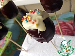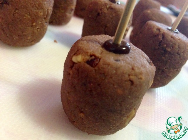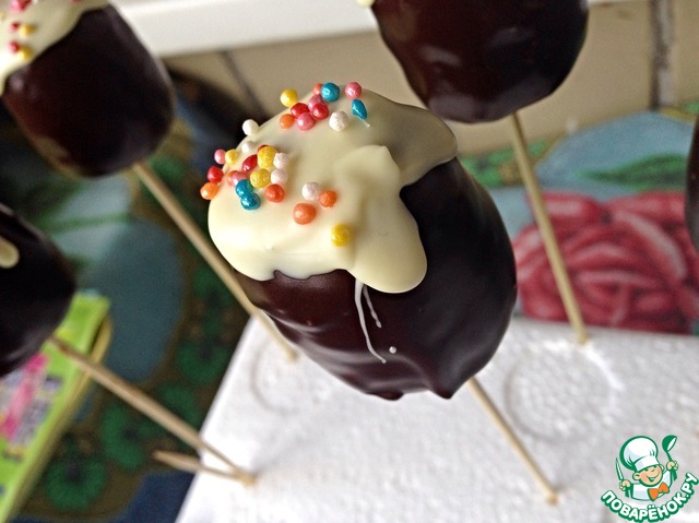 Растопить не много шоколада. Край палочки (у меня зубочистка) опустить в шоколад и вставить в кейк попсы, не очень глубоко! Убрать минут на 10 в холодильник.