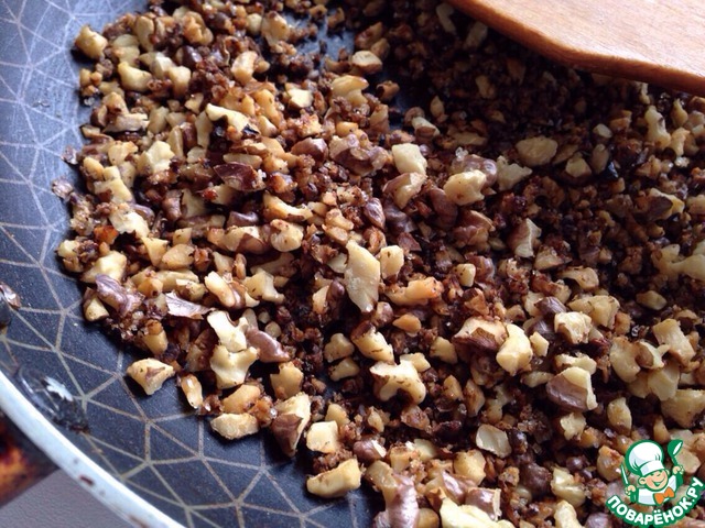 Орехи измельчить ножом. Затем прожарить минуту-две на раскаленной сковороде, добавить 2 чайные ложки сахар и еще прожарить 1-2 минуты. Дать остыть и добавить к бисквитной крошке.