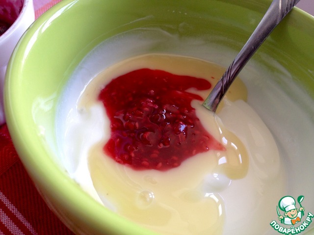 Смешать сливочный сыр (крем-сыр, маскарпоне или даже жирную сметану) со сгущённым молоком. Я еще добавила малину, ну это на любителя. А можно добавить коньяк или ликёр, но это для взрослых. Перемешать до однородной массы. -