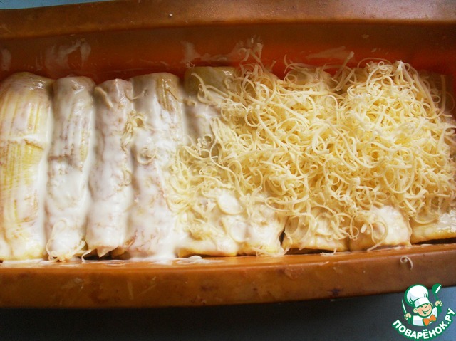 Так поступить со всеми блинчиками. Сложить их в форму, смазать сметаной и равномерно посыпать тертым сыром.