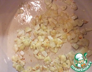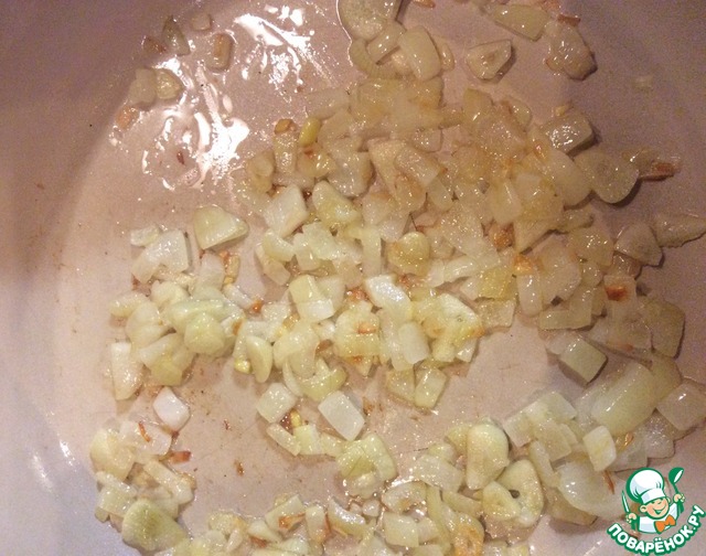Лук мелко нарезать, чеснок нарезать лепестками. На сковороде разогреть растительное масло и обжарить лук и чеснок до золотистого цвета. Добавить в кастрюлю к морепродуктам.