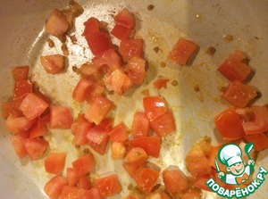 Помидор нарезать кубиком со стороной 1,5 см и обжарить при постоянном помешивании пару минут на той же сковороде, на которой жарились лук и чеснок.