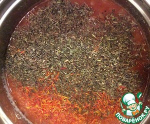 Довести суп до кипения и добавить шафран, сухой базилик, прованские травы и лимонный сок. Перемешать, попробовать и посолить по вкусу. После закипания варить еще около 7 минут.