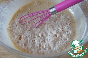 Влить запенившиеся дрожжи, перемешать, накрыть миску пленкой и убрать в теплое место на 1,5 часа.