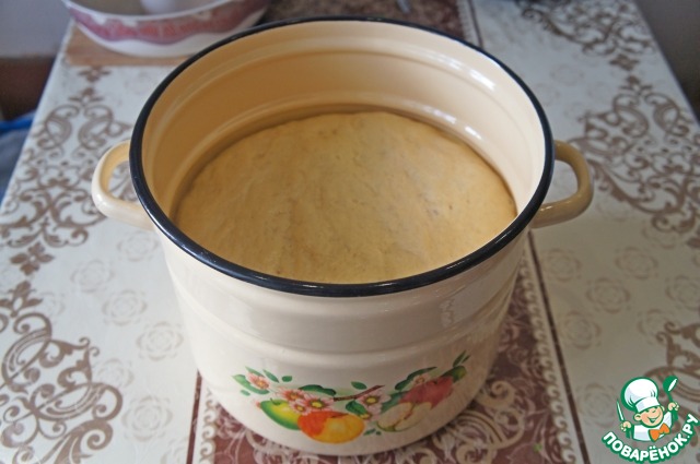 Положить тесто в большую глубокую кастрюлю (у меня 9 л), накрыть полотенцем, затем крышкой и поставить в теплое место на 5 часов.