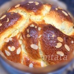 5 яиц, 3 желтка, 100 мл сливок, 50 мл молока, 175 г сливочного масла, 50 мл растительного масла (арахисового), 1 кг муки, 250 г сахара, 25 г ванильного сахара. 75 г миндаля, 30 г дрожжей, 1/2 ч. л. соли.