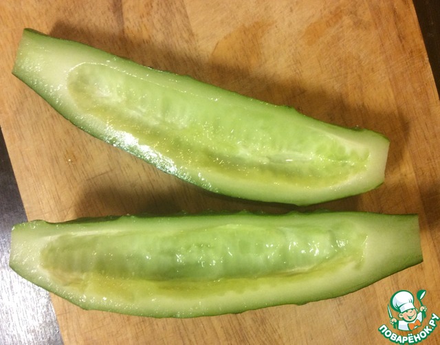 Огурец разрезать вдоль, извлечь семена и нашинковать соломкой.