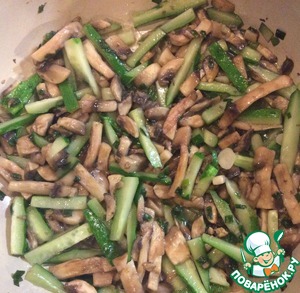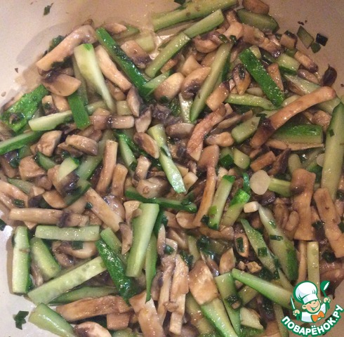 Добавить нарезанные грибы и огурец в сковороду. Обжаривать около 5 минут.