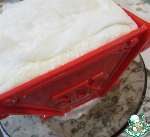 Затем положите в неё творожную массу, плотно прижимая её. Накрыть массу, концами марли.
