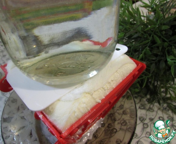 Сверху положить тарелку или доску, поставить гнет. Саму форму с пасхой тоже поставить в глубокую тарелку, т. к. в процессе стояния, с неё будет стекать жидкость, которую надо периодически сливать. Убрать пасху на ночь или даже больше в холодильник.