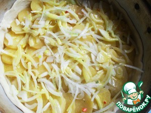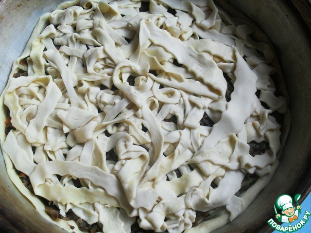 Выкладываем эти полоски поверх начинки, придавая им "художественный бардак". Смазываем желтком и отправляем в духовку на 25-30 минут. Температура 200*.