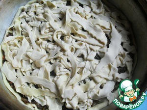 Дрожжевое тесто раскатываем, смазываем смальцем и нарезаем тонкие полоски (примерно 1 см шириной).