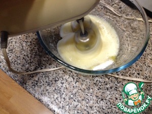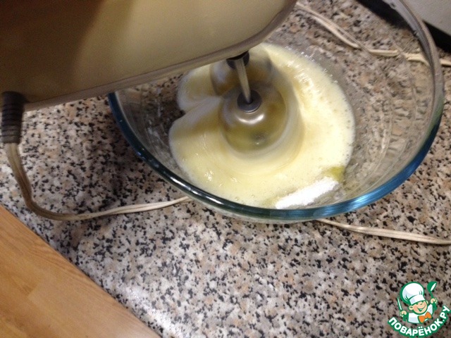 Растопить 100 г масла и добавить в яично - сахарную смесь. Продолжать взбивать на средних оборотах.
