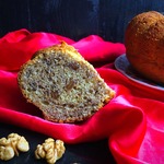 Орехи нарезать ножом или раздробить скалкой, но не в крошку, а до состояния кусочков. Изюм вымыть и обсушить бумажным полотенцем. Во взбитую смесь добавляем гашеную соду, специи, орехи, изюм. Просеиваем и добавляем частями муку. Перемешиваем лопаткой. Тесто должно быть консистенции густой сметаны.