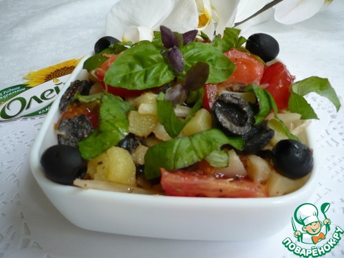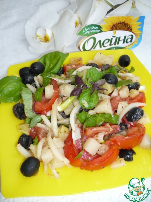 Теперь смешать все ингредиенты для салата и заправить по вкусу подсолнечным маслом "Олейна", добавить соль, перец, сушёный орегано и измельчённый свежий базилик. По желанию можно добавить капельку уксуса в салат.