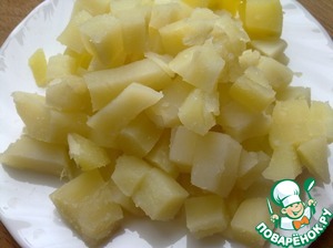 Картофель отварить до готовности. Затем остудить и нарезать крупными кусочками.