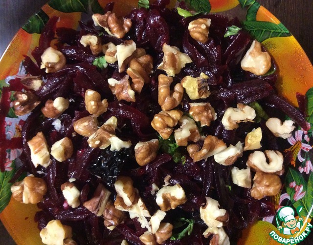 Добавить мелко нарезанную зелень петрушки, чернослив и еще раз перемешать. Грецкие орехи слегка порубить ножом и посыпать ими салат.