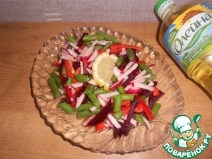 Заправить растительным маслом Олейна и лимонным соком. Украсить долькой лимона.