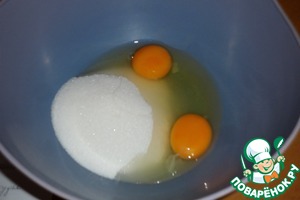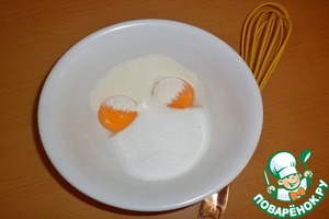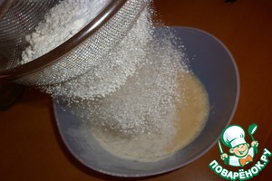 Ввести в смесь просеянную с разрыхлителем муку, смешать до однородного состояния.