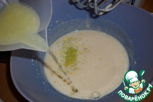 Добавить растительное масло, воду, сок и измельчённую (натёртую на мелкой тёрке) цедру лимона. Всё тщательно перемешать (можно воспользоваться миксером).