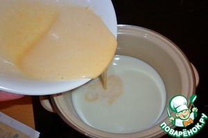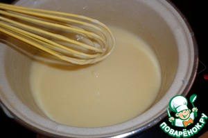 В разогретое молоко добавить желтковую смесь и, постоянно помешивая, варить на маленьком огне до загустения.