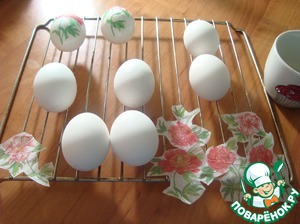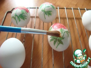 Яйца варю на Пасху 2 часа в подсоленной воде. Самые вкусные яйца. Сливаю воду и заливаю яйца холодной водой. Пусть немного постоят и остынут. Вытираю насухо. Белок помещаем в чашку, готовим кисточку, решётку (на ней будут сохнуть яйца). Из салфетки вырезаем красивые рисунки. Кисточкой, обмазанной белком, намазываем место на яйце, где будет приклеиваться рисунок.