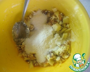 • Добавить яблоко к тесту и аккуратно перемешать. Всыпать сахар и разрыхлитель теста. Добавить корицу и мускатный орех, перемешать.