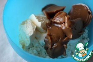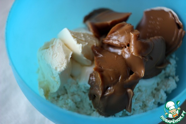 Соедините творог, сметану, сливочное масло и вареную сгущенку.