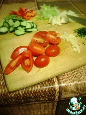Овощи помыть, нуждающиеся очистить и нарезать. Лук и перец – лепестками, сельдерей и острый перец – тонкими колечками, огурцы кружочками тонко и помидоры на половинки. Чеснок изрубить, зеленый лук нашинковать.