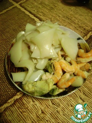 Разложить морепродукты по тарелкам, добавить жареную лапшу, разбирая ее руками на отдельные нити, посыпать зеленым луком и сразу же подавать.