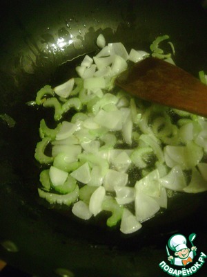 Разогреть масло – две ложки – и опустить в него лук, сельдерей и немного чеснока. Помешивая, прогревать, не давая совершенно румяниться, а только развивать аромат.