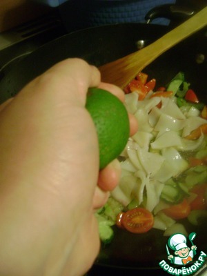 Добавить огурцы, помидоры и перец. Прогреть минутку. Выложить кальмара, полить лаймовым соком и жарить, помешивая, 1,5 минуты.