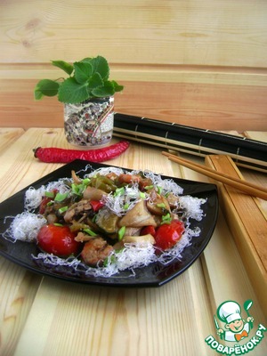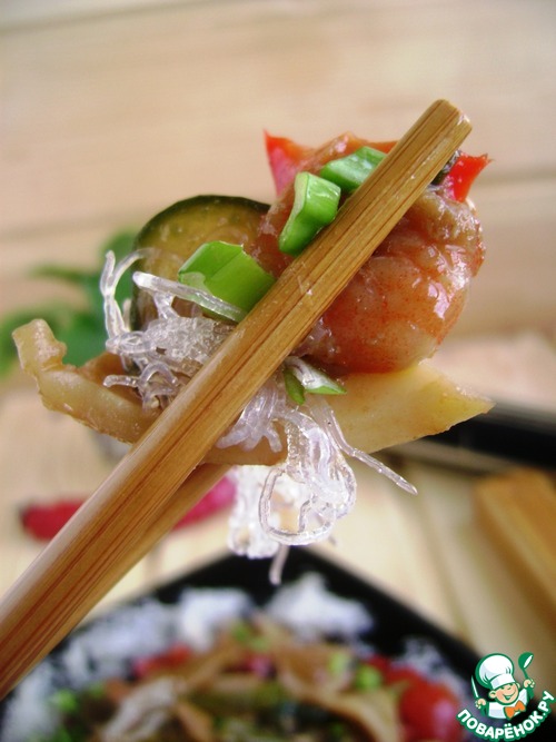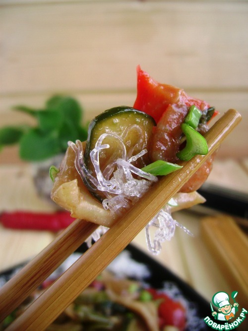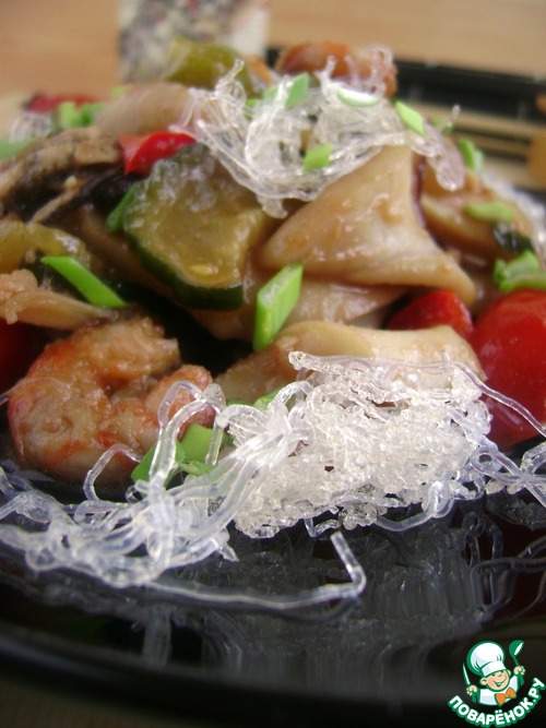 Мы очень любим морепродукты. Что довольно странно, учитывая, что на море мы почти не были. Но любим, и поэтому я их часто готовлю. А в этом блюде любовь к острому отлично сочетается с морепродуктами тоже. Сочные, ароматные и вкусные кальмары, креветки и мидии с похрустывающими овощами и острым пряным соусом – наслаждение! Кальмары получаются очень нежными, просто тают во рту. А добавление чуть хрустящей и очень красивой жареной фунчозу – действительно стеклянной – или хрустальной –как ее еще называют –очень украшают блюдо как по вкусу, так и по внешнему виду.