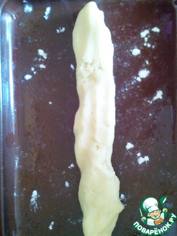 У меня два прямоугольных противня. Смазываем противни маслом и присыпаем мукой. Каждую часть скатываем колбаской по длине противня.