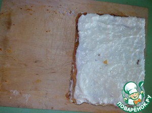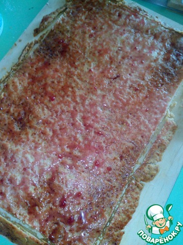 Горячие коржи смазываем джемом или вареньем. Обрезаем неровные края. Аккуратно. Коржи очень хрупкие.