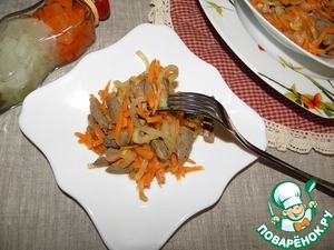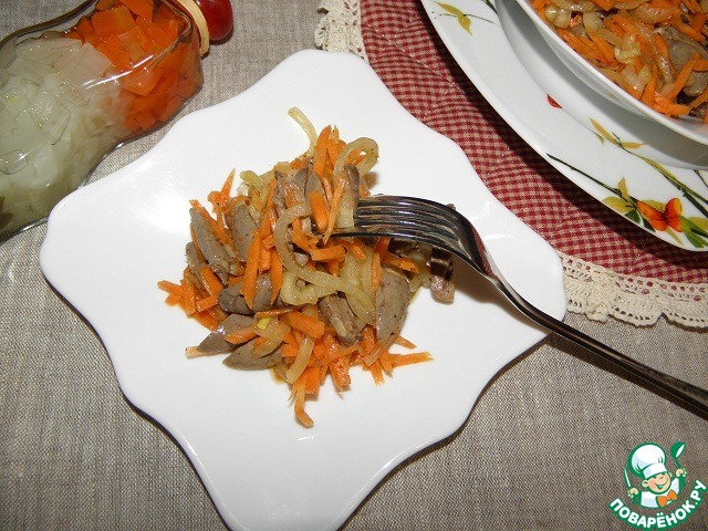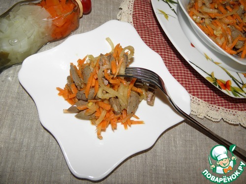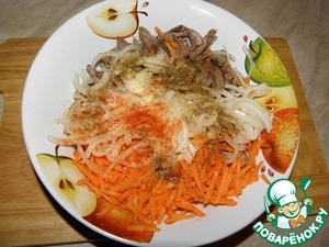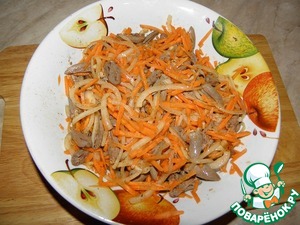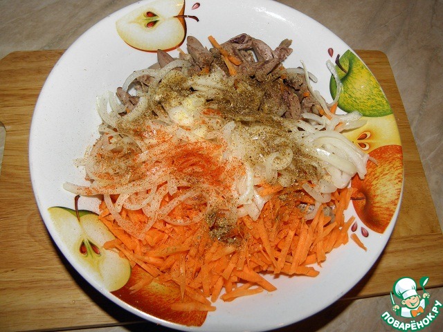 Соединяем сердечки, морковь, маринованный лук, добавляем приправу для морковки по-корейски, (красный перец по желанию), если приправа недостаточно соленая, еще соли ( мне всегда она требуется)