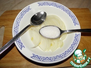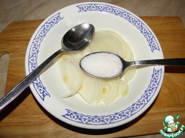 В оригинале рецепта предлагается 1ч. л уксуса и сахарную пудру добавить непосредственно в блюдо.. А мне очень понравился вариант, который я вам предложила. Идея маринованного лука принадлежит Олечки Демурия! Очень ей благодарна! -