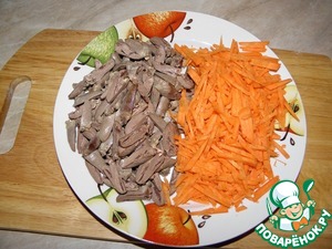 Сердечки режем соломкой, морковь трем на корейской терке, только средней