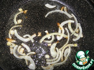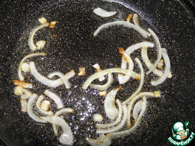 Для заправки: В разогретом растительном масле (его должно быть достаточное кол-во) обжариваем лук, лук потом нам не пригодится, будет нужен только его аромат. Затем удаляем лук, и горячим маслом заливаем наше блюдо.