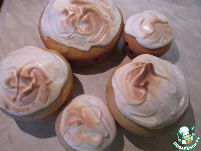 И последний штрих: Белки взбить с сахарной пудрой, нанести сверху на куличи и подержать под грилем, пока не зарумянятся.