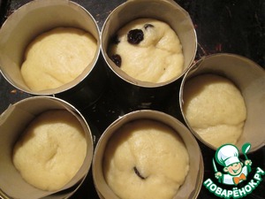 Тесто поставить в теплое место примерно на час. Распределить по формам. У меня получилось пять обычных и еще пять жестяных баночек, в которые я вставила полоски пекарской бумаги вдоль стенок. На фото куличи в обычных формах после расстойки в течении часа.