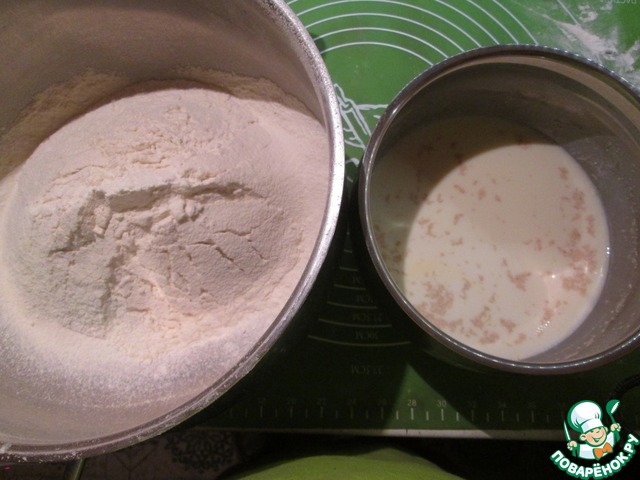 Молоко подогреть до температуры 36 - 38 градусов ( оно должно быть чуть теплее температуры вашего тела ), просеять 0,5 кг. муки, хорошо размешать и поставить в теплое место на 15 - 20 минут.