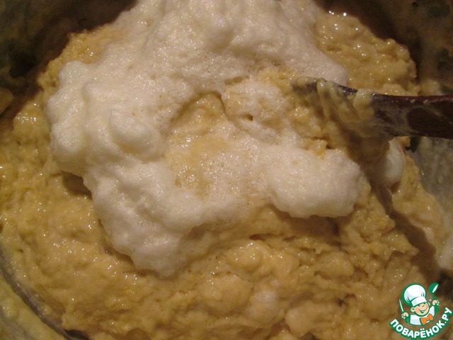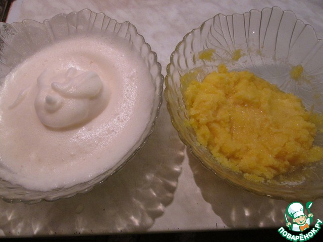 Яйца разделить. Желтки растереть с сахаром, белки взбить с солью до мягких пиков.