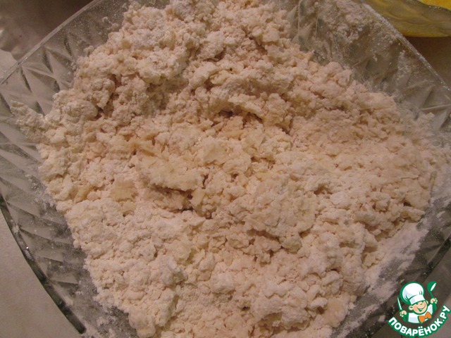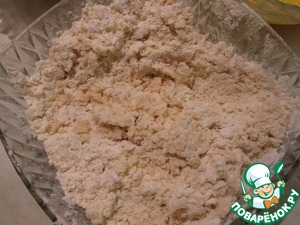 Просеять еще 0,5 кг. муки, добавить мягкое сливочное масло и растереть в крошку.