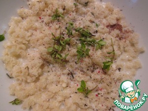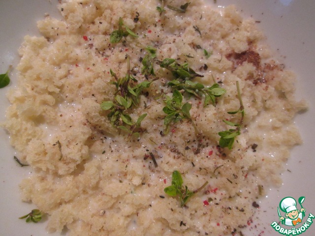 Хлебную крошку залить молоком, добавить листочки тимьяна, мускатный орех, соль, перец.