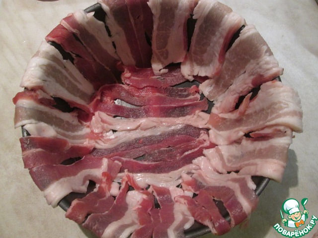 Форму, в которой будет запекаться паштет выстелить полосками бекона так, чтобы края полосок свисали.