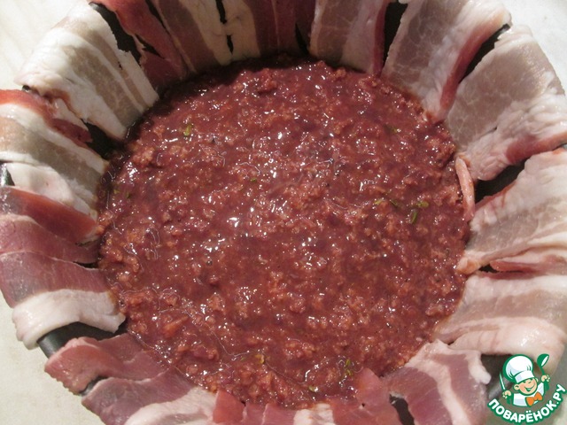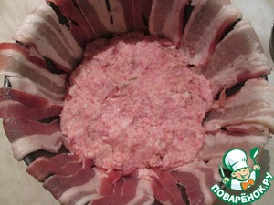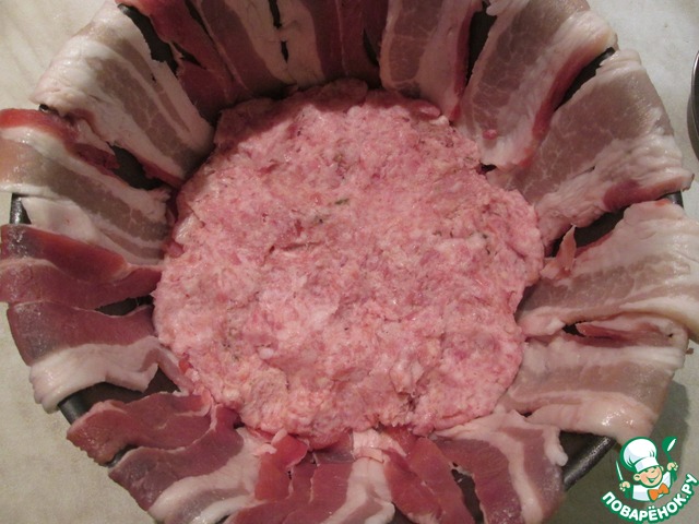 Фарш посолить, поперчить и выложить в форму на полоски бекона.
