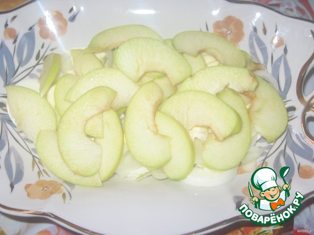 Следующий - порезанное тонкими ломтиками яблоко, соус.