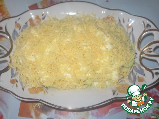 Сверху все обильно посыпаем тертым сыром. Дать настояться несколько часов в холодильнике.